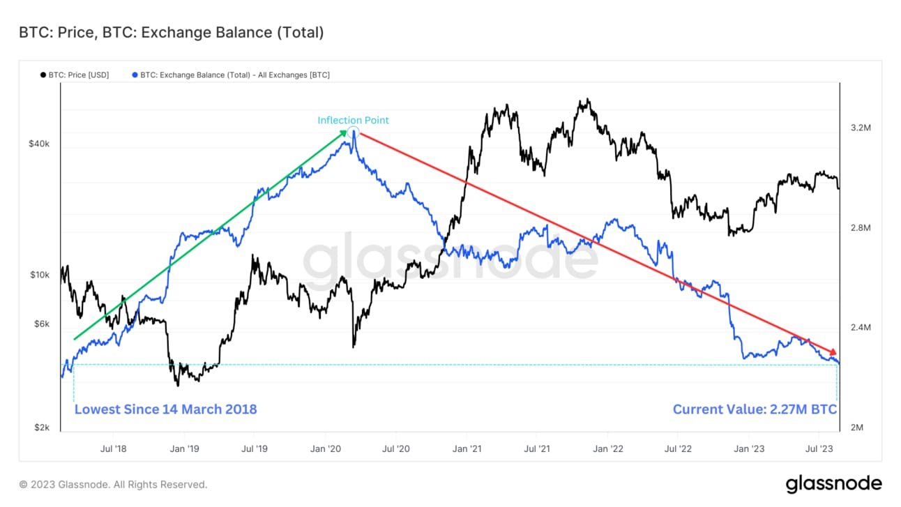 From March 2020 Exchange Balances have decreased by 940,000 Bitcoin, this is 4.83% of the total Bitcoin supply