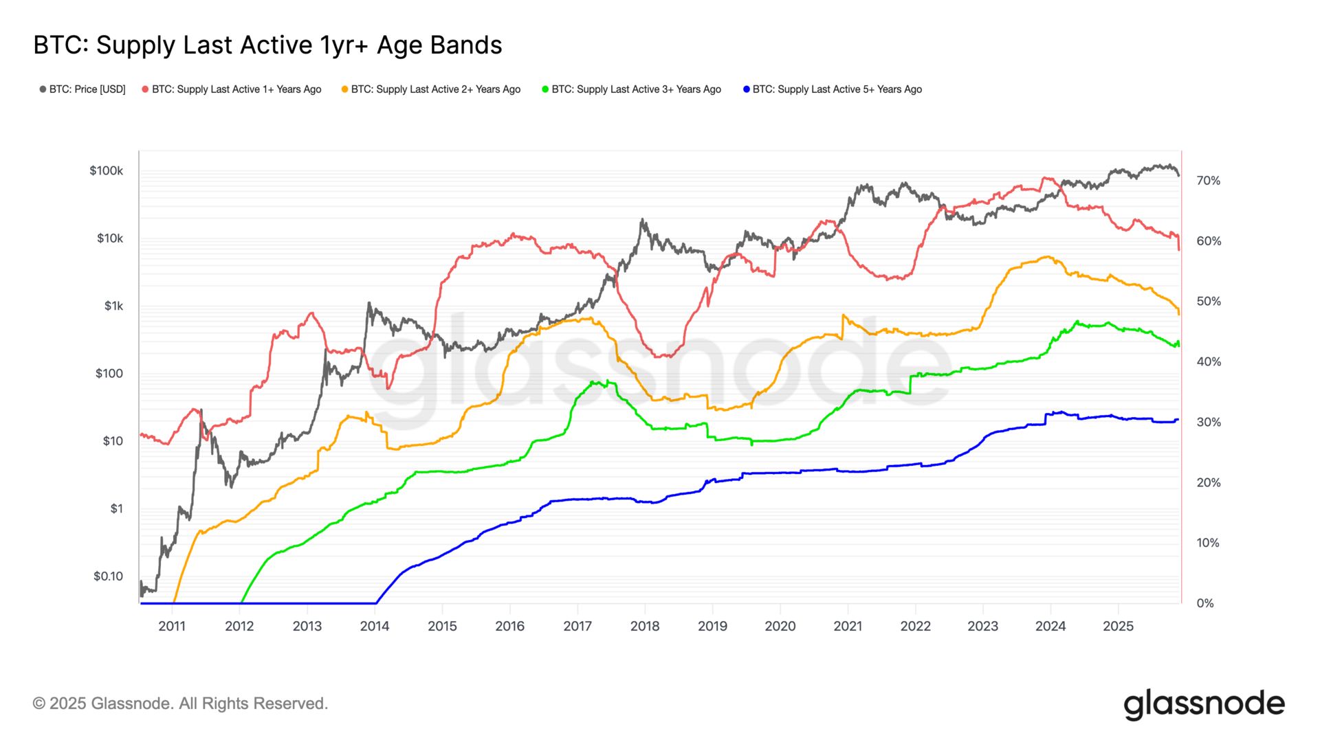 It’s a simple but powerful signal - tracking how much BTC has remained untouched as a percentage of total circulating supply.