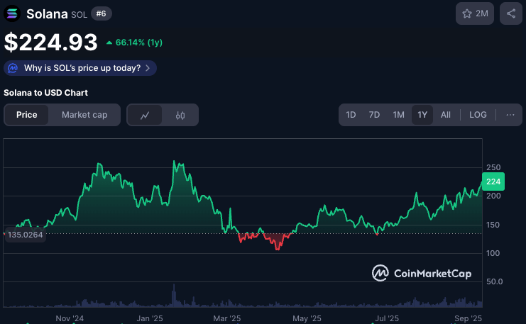Solana just hit a seven-month high at $225, up 25% in the past month and leading the top 10.