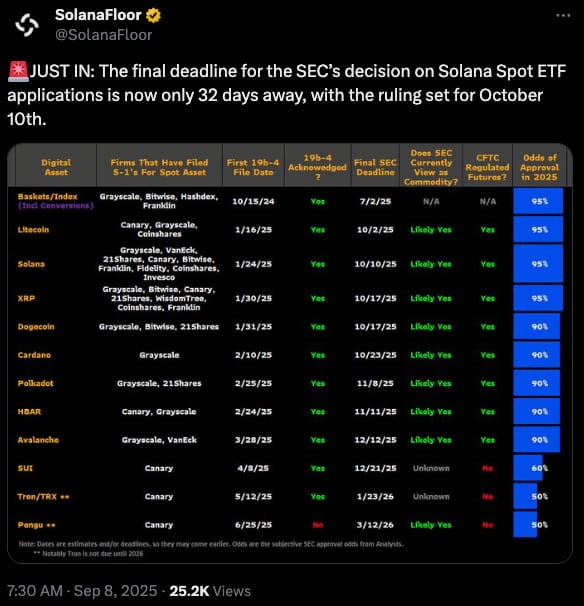 At the same time, the SEC is set to rule on seven spot Solana ETF filings by October 10.
