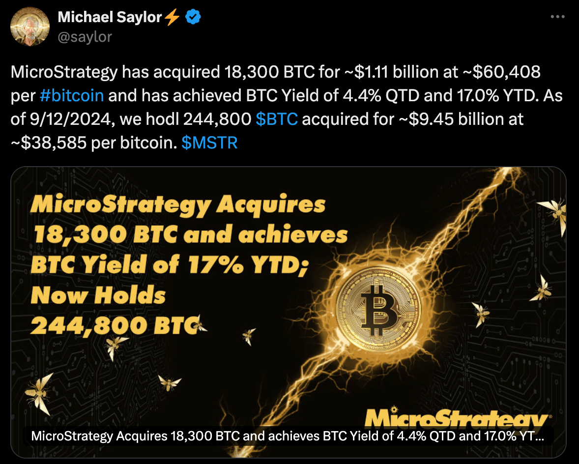 Michael Saylor’s MicroStrategy has purchased an additional 18,300 Bitcoin for ~$1.11 billion at ~$60,408 per Bitcoin.