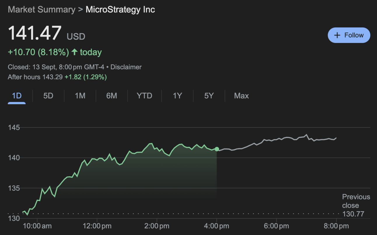 Off the back of this purchase, MicroStrategy stock is up 8.18% on the day.