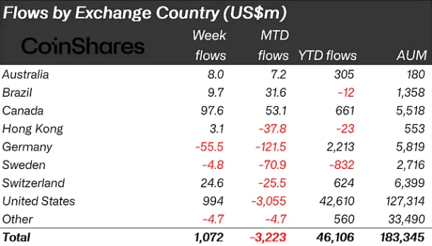Canada and Switzerland followed with inflows of $97.6 million and $24.6 million respectively.