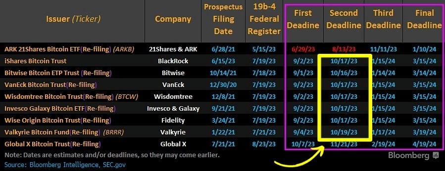 First - there’s a bunch of spot Bitcoin ETF deadlines coming up right in the middle of October.