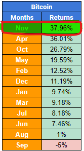 As it turns out, November is actually Bitcoin’s best performing month, with average gains of 37.96%.