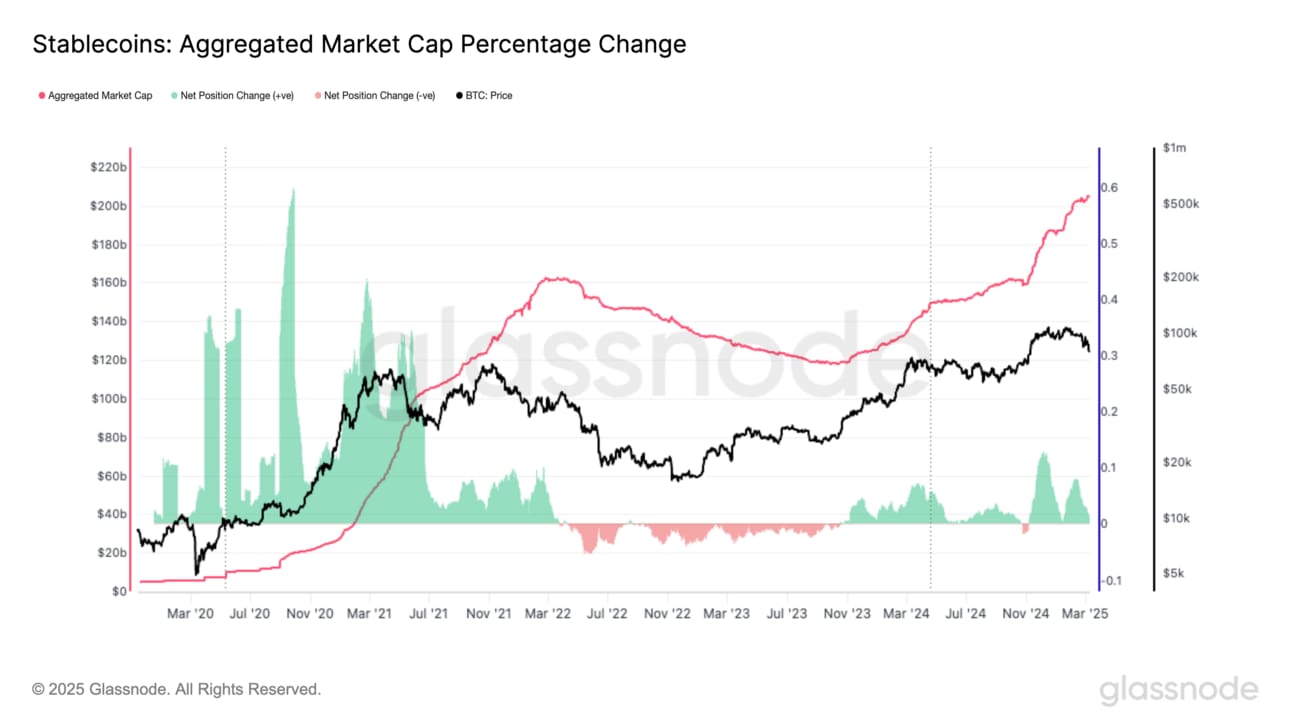 The chart below tracks the aggregate change in the total stablecoin market cap.